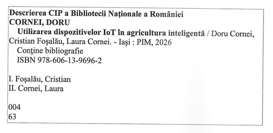 In luna ianuarie 2026 a apărut cartea intitulată „Utilizarea dispozitivelor IoT în agricultura inteligentă”, autori Doru Cornei, Cristian Foşalău şi Laura Cornei.