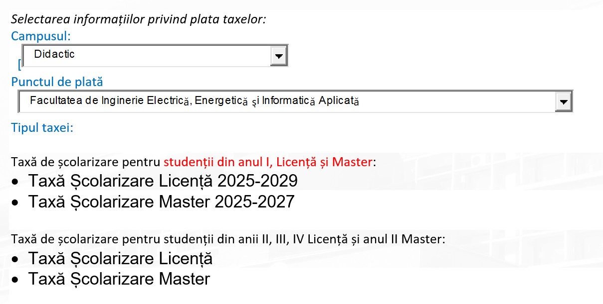 Stimați studenți, Vă informam că se pot efectua plăți online pentru toate tipurile de taxe universitare: https://www.tuiasi.ro/noutati/studentii-tuiasi-pot-sa-plateasca-integral-toate-taxele-online-pe-o-platforma-dezvoltata-de-specialistii-universitatii https://taxe.tuiasi.ro/informare.php După ce bifați că sunteți de acord cu condițiile GDPR, deschideți formularul de plată online, introduceți datele dvs. de student, selectați campusul DIDACTIC, facultatea, tipul de taxă.
